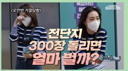 "전단지 300매를 2시간 안에 돌려서 2만 3,000원을 받는 부업. 시급은 만원이 넘었습니다만 전단지를 배포하는 것 자체가 대면업무다 보니까 코로나19 시국에 꺼려졌던 것도 사실입니다. 게다가 전단지를 나눠주면서 반말로 무시를 당하거나 그냥 지나치는 사람들을 마주할 때면 괜스레 위축됐는데요. 아무래도 이번 전단지 부업은 `육체노동`을 빙자한, 마음에 상처를 받는 대가로 돈을 버는 `감정노동`에 가깝지 않았나 싶습니다. 지금까지 이지효 기자였습니다."