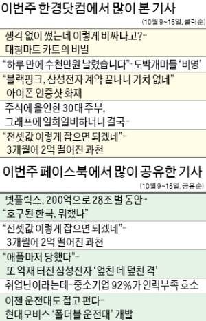 네티즌이 이번주 한경닷컴에서 가장 많이 본 기사는 10월 9일자 <생각 없이 썼는데 이렇게 비싸다고?…대형마트 카트의 비밀 >이었다. 유통업계 대세로 떠오른 온라인에 맞서 대형마트가 악전고투하고 있다는 내용을 다뤘다.