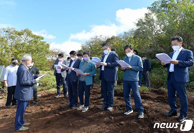 (제주=뉴스1) 오미란 기자 = 제주도의회 환경도시위원회(위원장 강성의) 관계자들이 15일 오전 제주 서귀포시 색달동 1100고지 인근 제주남부항공로 레이더 시설 공사 현장을 시찰하고 있다.(제주도의회 제공)2021.10.15/뉴스1