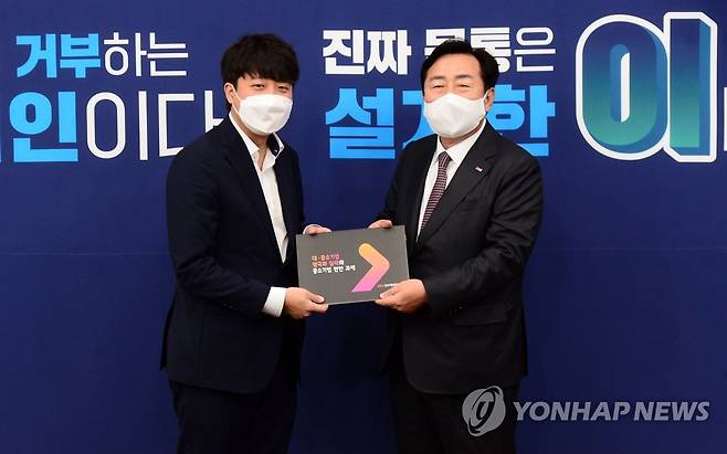 (서울=연합뉴스) 전수영 기자 = 국민의힘 이준석 대표와 김기문 중소기업중앙회장이 15일 오전 서울 여의도 국회에서 열린 국민의힘-중소기업중앙회 간담회에서 기념사진을 찍고 있다. 2021.10.15 [국회사진기자단]