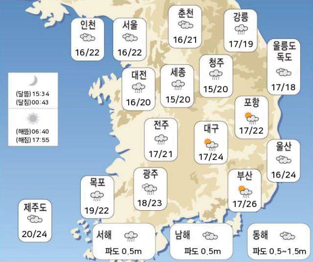 현재 기온은 서울 22도, 인천 21도, 수원 21도, 춘천 20도, 강릉 17도, 청주 20도, 대전 20도, 전주 20도, 광주 21도, 대구 22도, 부산 24도, 제주 23도 입니다.