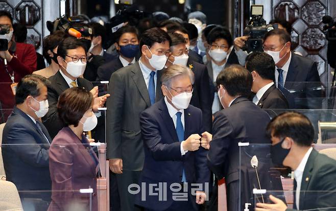 [이데일리 이영훈 기자] 이재명 대선 후보가 15일 오전 서울 여의도 국회 예결위회의장에서 열린 더불어민주당 의원총회에서 당 지도부와 함께 입장하고 있다.
