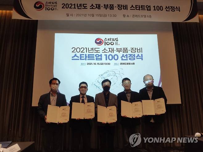 (서울=연합뉴스) 차정훈 창업벤처혁신실장이 전날 서울 콘래드호텔에서 열린 2021년도 소재·부품·장비 스타트업 100 선정식에서 분야별 5개 우수 기업을 선정했다고 15일 밝혔다. 사진은 선정서를 들고 기념 촬영하는 관계자들. 2021.10.15