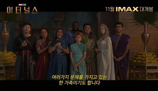 10명의 '이터널스'의 모습도 공개됐다. 강력한 히어로이면서 동시에 하나의 가족 같은 모습을 한 멤버들의 특별한 모습이 눈길을 사로잡는다. 다함께 가족 사진을 찍듯 환하게 웃거나 식탁에 둘러 앉아 식사를 즐기는 모습이다. 특히 마동석과 리차드 매든 등이 시선을 끈다.
