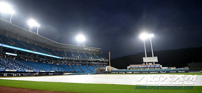 2021 KBO리그 키움 히어로즈와 삼성 라이온즈의 경기가 15일 대구 삼성라이온즈 파크에서 열렸다. 경기 시작을 앞두고 경기장에 비가 내려 방수포가 덮여있다. 대구=허상욱 기자 wook@sportschosun.com/2021.10.15/