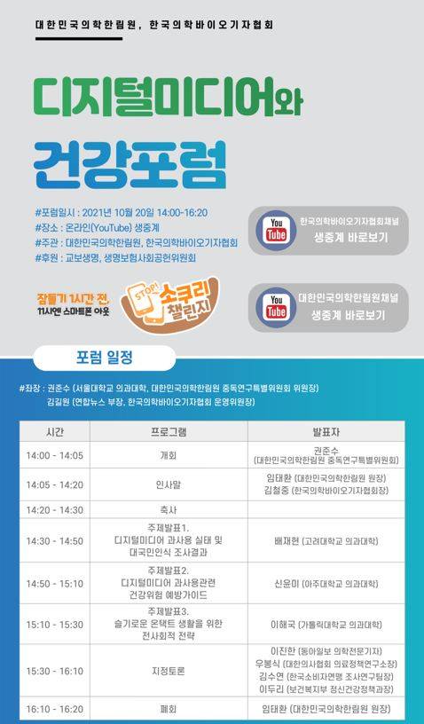 대한민국의학한림원(원장 임태환)과 한국의학바이오기자협회(회장 김철중)가 오는 20일 디지털미디어 과사용 문제에 대한 국민 인식 제고를 위해 '디지털미디어와 건강포럼'을 온라인(유튜브) 생중계를 통해 개최한다.