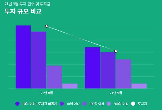 투자 건수도 8월과 비교하면 121건에서 29건 줄어든 92건으로 나타났다. 투자 금액별로는 300억원 이상 유치한 기업이 4건으로 같았고 100억원 이상 유치한 곳은 19건에서 24건으로 증가했다.