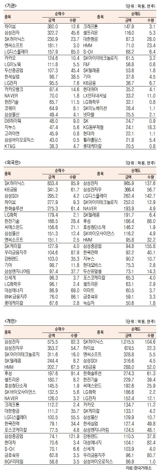 - [표]주간 유가증권 기관·외국인·개인 순매수·도 상위종목(10월 5일~8일)