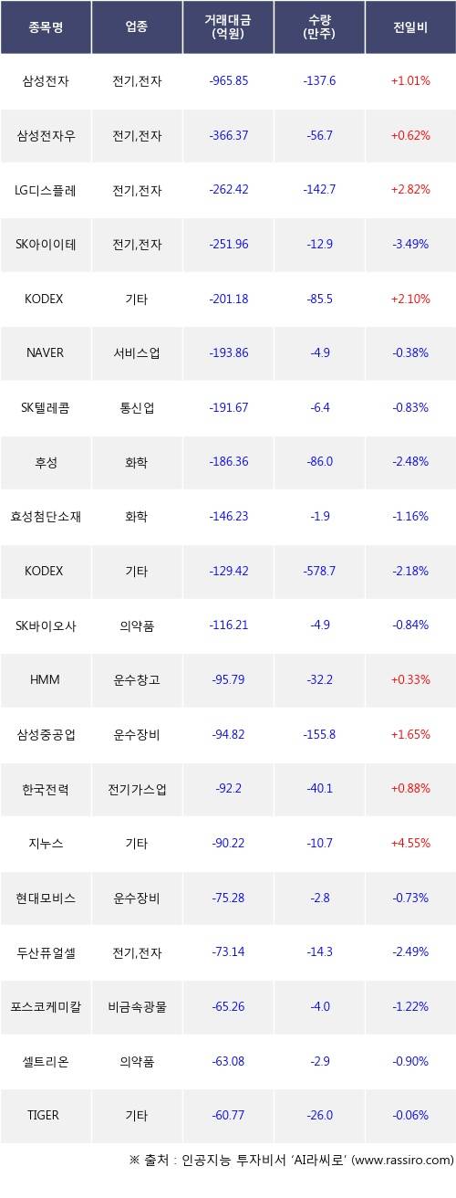 외국인 투자자의 순매도 상위 20개 종목은 삼성전자, 삼성전자우, LG디스플레이, SK아이이테크놀로지, KODEX 레버리지, NAVER, SK텔레콤, 후성, 효성첨단소재, KODEX 200선물인버스2X등이다.