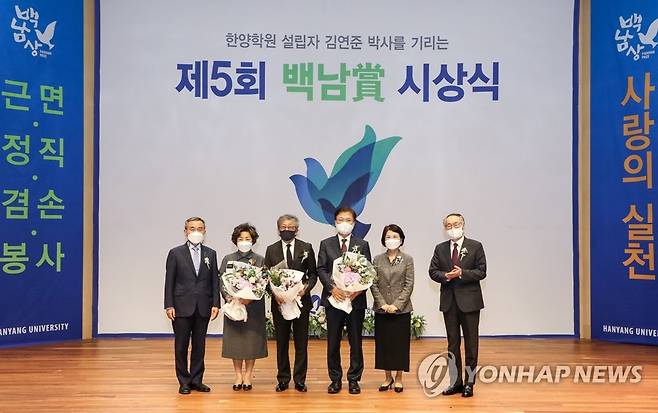 (서울=연합뉴스) 15일 서울 성동구 한양대에서 열린 제5회 백남상 시상식에서 수상자들이 기념촬영을 하고 있다. 오른쪽부터 김종량 백남기념사업회 이사장, 최양희 한림대 총장 내외, 김민 코리안챔버오케스트라 음악감독, 신경림 대한간호협회장, 김우승 한양대 총장. 2021.10.15 [한양대 제공. 재판매 및 DB금지]