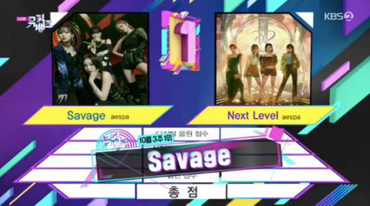 15일 방송된 KBS2 ‘뮤직뱅크’에서는 10월 셋째주 1위 후보곡으로 에스파의 노래 소개됐다. 후보는 에스파의 히트곡 ‘넥스트 레벨(Next Level)’과 신곡 ‘새비지(Savage)’로 에스파 대 에스파 대결이 예고돼 놀라움을 자아냈다.