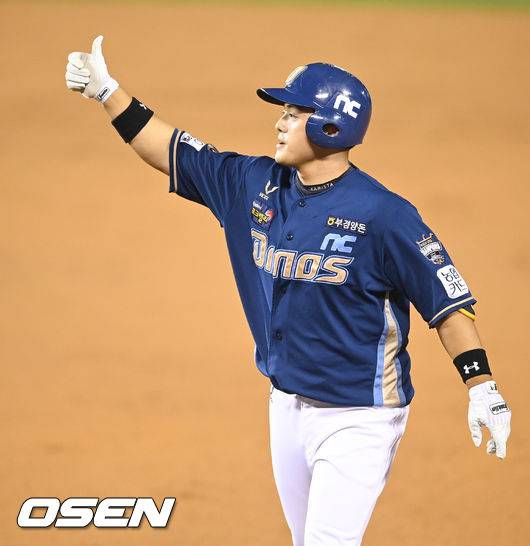 3회초 2사 2루 NC 강진성이 1타점 적시타를 날린뒤 엄지손가락을 보이고 있다. 2021.10.15 / soul1014@osen.co.kr