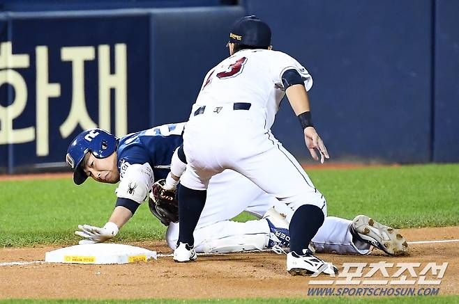 2021 KBO리그 두산 베어스와 NC 다이노스의 경기가 15일 잠실구장에서 열렸다. 3회초 1사 NC 양의지가 안타를 날린 뒤 3루까지 진루하고 있다. 잠실=박재만 기자 pjm@sportschosun.com/2021.10.15/