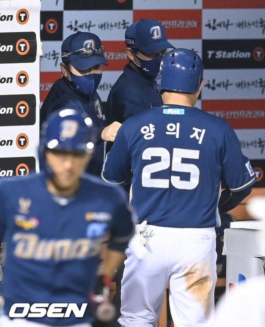 3회초 1사 3루 NC 알테어의 1타점 적시타때 홈을 밟은 3루 주자 양의지가 이동욱 감독과 하이파이브를 하고 있다. 2021.10.15 / soul1014@osen.co.kr