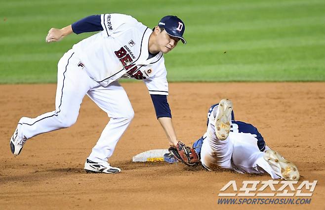2021 KBO리그 두산 베어스와 NC 다이노스의 경기가 15일 잠실구장에서 열렸다. 5회초 2사 1루 NC 알테어의 도루를 두산 유격수 박계범이 차단하고 있다. 잠실=박재만 기자 pjm@sportschosun.com/2021.10.15/