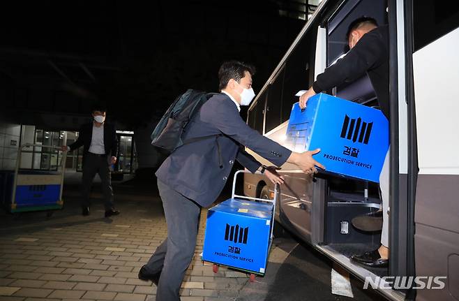 [성남=뉴시스] 김종택기자 = 서울중앙지검 대장동 개발 의혹 사건 전담수사팀이 15일 오후 경기도 성남시청에서 대장동 개발사업의 특혜 의혹과 관련한 압수수색을 마친 뒤 압수품을 옮기고 있다. 2021.10.15.