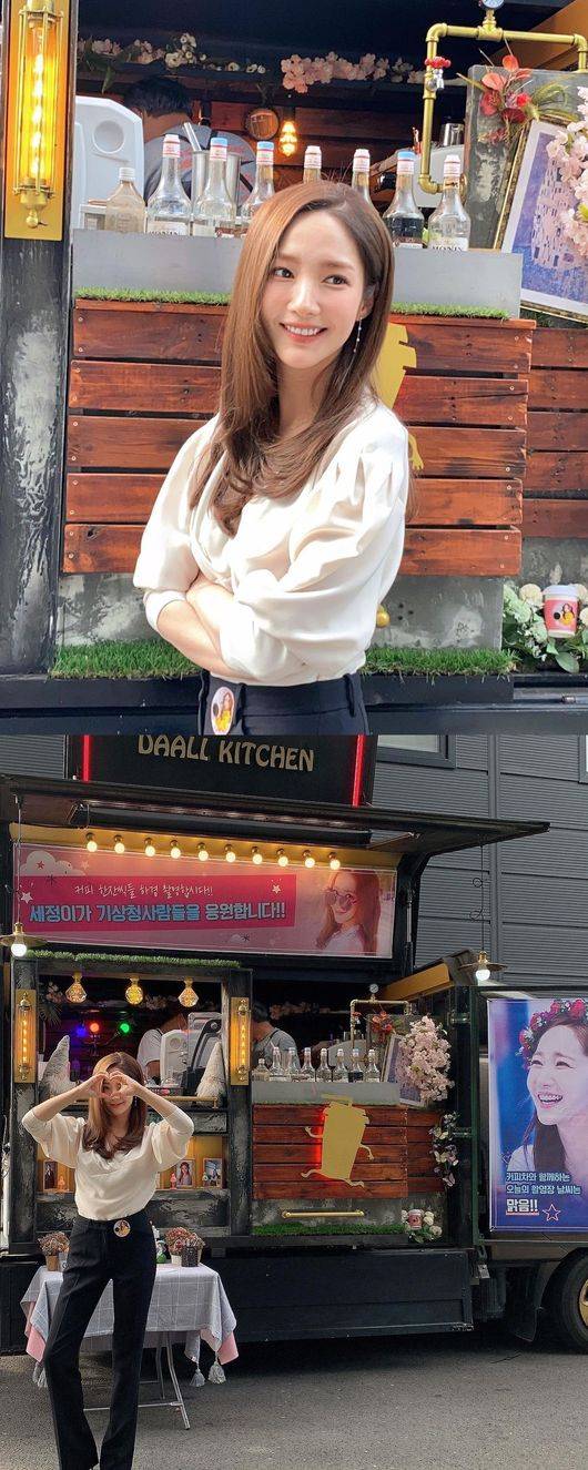 공개된 사진은 박민영이 김세정이 보낸 커피차 앞에서 포즈를 취하고 있는 모습.