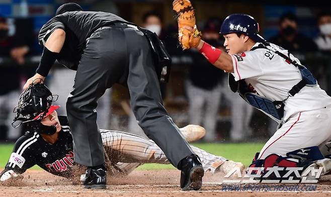 2021 KBO리그 롯데 자이언츠와 LG트윈스의 15일 부산사직야구장에서 열렸다. LG 이영빈이 4회초 1사 3루에서 유강남 유격수 땅볼때 홈에서 아웃되고있다. 롯데 2루수 안치홍. 부산=최문영 기자 deer@sportschosun.com /2021.10.15/