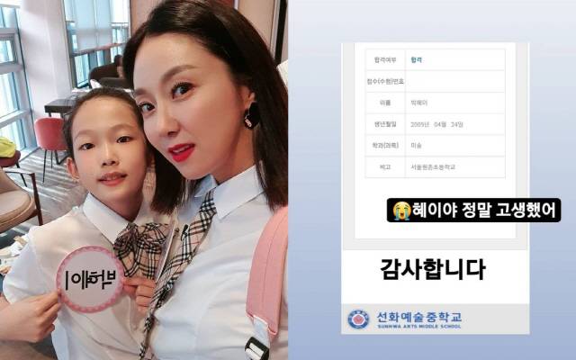 김지혜는 선화예술중학교 미술과에 합격한 딸 혜이 양의 합격증을 공개하며 "감사합니다. 혜이야 정말 고생했어"라고 칭찬했다.