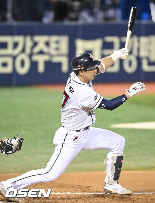 7회말 두산 선두타자 박건우가 이재학의 노히트행진을 깨는 팀 첫 안타를 날리고 있다. 2021.10.15 / soul1014@osen.co.kr