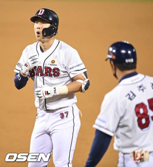 7회말 두산 선두타자 박건우가 이재학의 노히트행진을 깨는 팀 첫 안타를 날린뒤 기뻐하고 있다. 2021.10.15 / soul1014@osen.co.kr