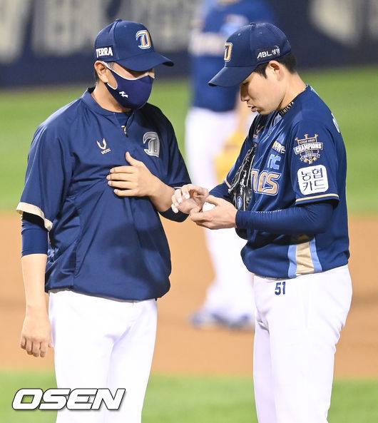 7회말 두산 박건우에게 첫 안타를 허용한 이재학 선발투수가 손민한 투수 코치와 이야기를 나누고 있다. 2021.10.15 / soul1014@osen.co.kr