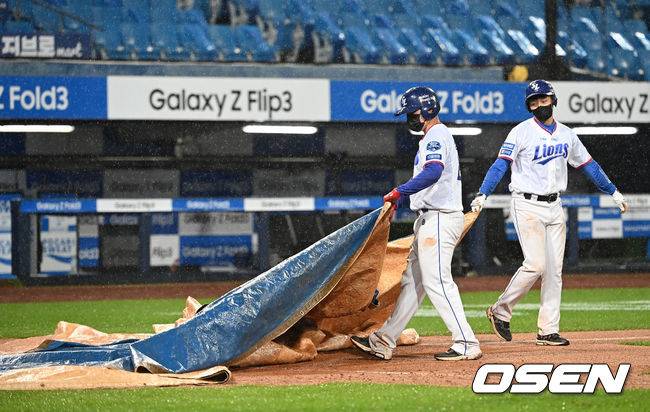 6회말 종료 후 경기장 요원들이 우천으로 방수포를 덮고 있다. 2021.10.15 /sunday@osen.co.kr