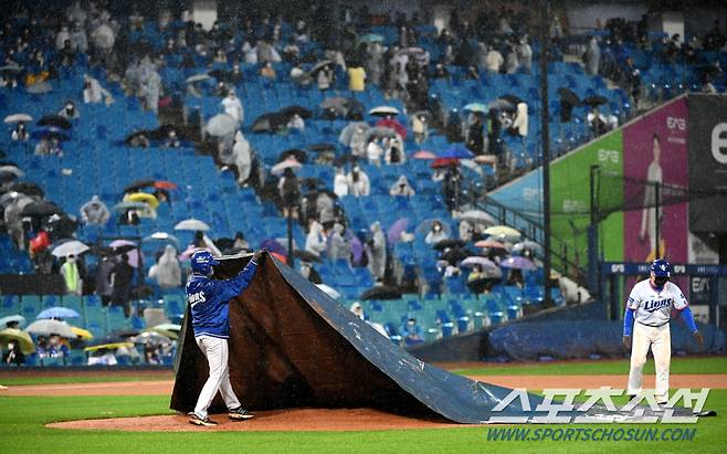 2021 KBO리그 키움 히어로즈와 삼성 라이온즈의 경기가 15일 대구 삼성라이온즈 파크에서 열렸다. 6회말 종료 후 경기가 우천으로 중단되며 방수포가 설치되고 있다. 대구=허상욱 기자 wook@sportschosun.com/2021.10.15/