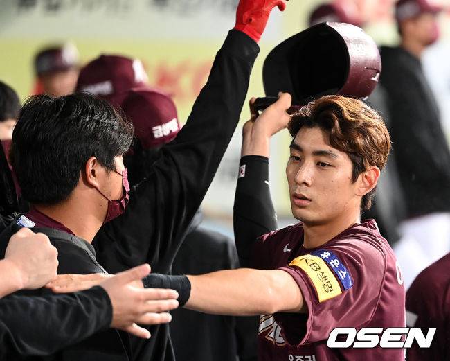 6회말 2사 3루에서 키움 송성문의 우전 적시타 때 홈을 밟은 3루주자 이정후가 더그아웃에서 동료들의 축하를 받고 있다. 2021.10.15 /sunday@osen.co.kr