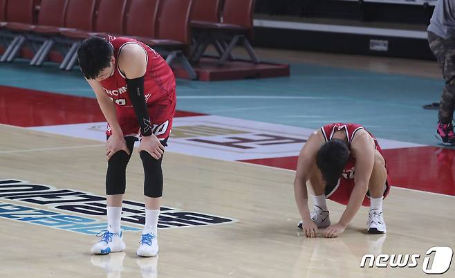 (창원=뉴스1) 여주연 기자 = 15일 오후 경남 창원실내체육관에서 열린 '2021-2022 KGC인삼공사 정관장 프로농구' 창원 LG 세이커스 대 원주 DB 프로미의 경기에서 71 대 73으로 역전패 당한 LG 선수들이 고개를 숙이고 있다. 2021.10.15/뉴스1