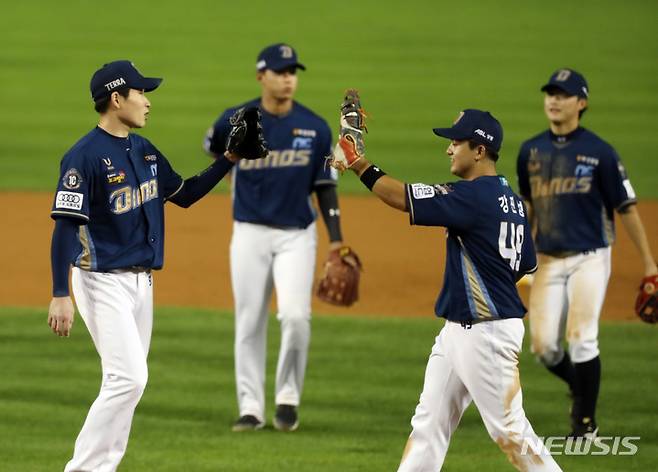 [서울=뉴시스]고승민 기자 = 15일 서울 잠실야구장에서 열린 2021 KBO 리그 NC 다이노스 대 두산 베어스 경기, 5대 0으로 두산을 꺾은 NC 선수들이 자축하고 있다. 이날 NC 선발투수 이재학은 8년만의 완봉승을 거뒀다. 2021.10.15. kkssmm99@newsis.com