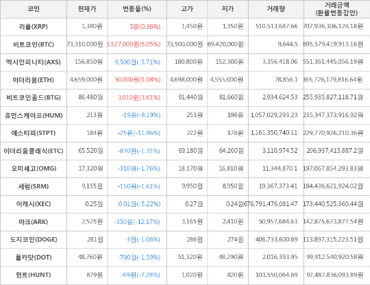 또한, 에스티피(-11.96%, 184원), 휴먼스케이프(-8.19%, 213원), 헌트(-7.28%, 879원), 엑시인피니티(-5.71%, 156,850원), 이캐시(-5.22%, 0.25원), 오미세고(-1.76%, 17,320원), 세럼(-1.61%, 9,155원), 폴카닷(-1.59%, 48,760원), 이더리움클래식(-1.31%, 65,520원), 도지코인(-1.06%, 281원)이 하락세를 나타냈다.