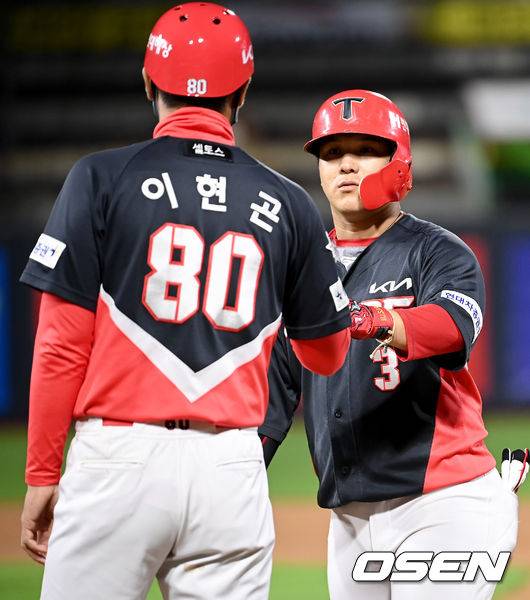 6회초 2사 만루 KIA 김선빈이 1타점 적시타를 날린 뒤 이현곤 코치와 기쁨을 나누고 있다. 2021.10.15 / ksl0919@osen.co.kr
