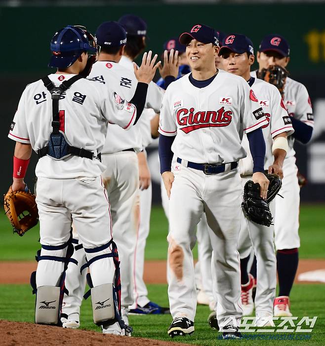 2021 KBO리그 롯데 자이언츠와 LG트윈스의 15일 부산사직야구장에서 열렸다. 롯데 손아섭과 선수들이 팀의 4대2 승리를 확정짓고 하이파이브 하고 있다. 부산=최문영 기자 deer@sportschosun.com /2021.10.15/