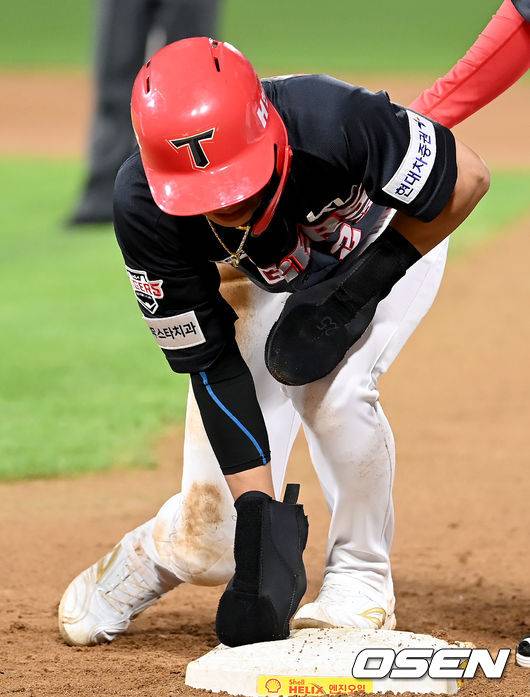 8회초 무사 1루 KIA 유민상의 타석 때 1루 주자 박찬호가 KT 투수 박시영의 견제구에 허벅지를 맞고 고통스러워하고 있다. 2021.10.15 / ksl0919@osen.co.kr