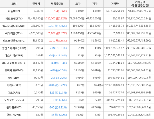 가상화폐 시세 (제공: 암호화폐 거래소 업비트)현재 암호화폐 거래소 "업비트"에 따르면 가상화폐 대장 격인 비트코인의 시세는 전일 대비 3,715,000원(5.32%) 상승한 73,498,000원에 거래되고 있다.
