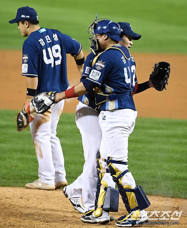 2021 KBO리그 두산 베어스와 NC 다이노스의 경기가 15일 잠실구장에서 열렸다. NC 이재학이 완봉승을 기록한 뒤 포수 김태군과 함께 기쁨을 나누고 있다. 잠실=박재만 기자 pjm@sportschosun.com/2021.10.15/