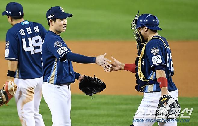 2021 KBO리그 두산 베어스와 NC 다이노스의 경기가 15일 잠실구장에서 열렸다. NC 이재학이 완봉승을 기록한 뒤 포수 김태군과 함께 기쁨을 나누고 있다. 잠실=박재만 기자 pjm@sportschosun.com/2021.10.15/