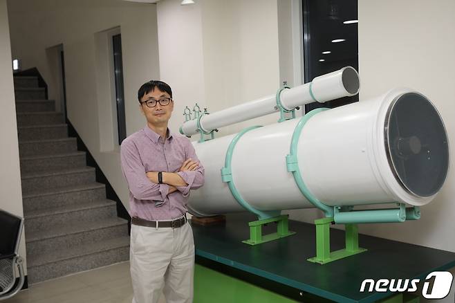 (서울=뉴스1) = 15일 오후 서울대학교 천문대에서 열린 2021 관악강감찬축제의 별 관측 프로그램 ‘낙성대야별회’에서 강연을 진행한 황호성 서울대학교 물리천문학부 교수가 망원경 앞에서 포즈를 취하고 있다. (관악문화재단 제공) 2021.10.15/뉴스1