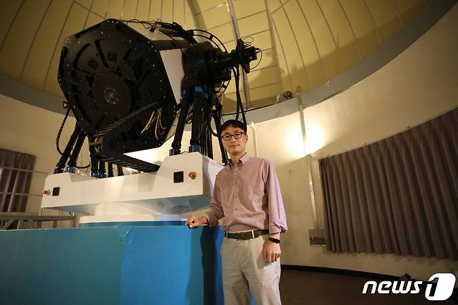 (서울=뉴스1) = 15일 오후 서울대학교 천문대에서 열린 2021 관악강감찬축제의 별 관측 프로그램 ‘낙성대야별회’에서 강연을 진행한 황호성 서울대학교 물리천문학부 교수가 망원경을 소개하고 있다. (관악문화재단 제공) 2021.10.15/뉴스1