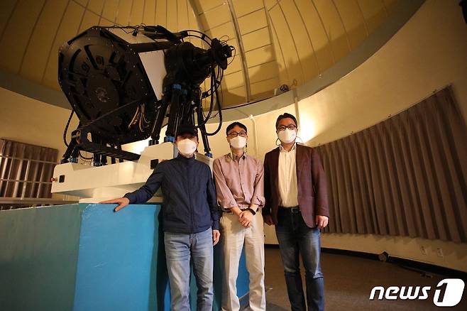 (서울=뉴스1) = 15일 오후 서울대학교 천문대에서 열린 2021 관악강감찬축제의 별 관측 프로그램 ‘낙성대야별회’ 참석자들이 기념촬영을 하고 있다. 사진 왼쪽부터 관악강감찬축제 조정국 총감독, 황호성 서울대학교 물리천문학부 교수, 관악문화재단 차민태 대표이사. (관악문화재단 제공) 2021.10.15/뉴스1