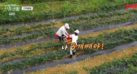 정경호와 전미도가 점심을 준비하는 동안 조정석 김대명 신현빈은 일당을 벌기위해 고추밭으로 출발했다. 신현빈은 한 번에 고추 세 개를 따는 압도적 스피드로 고추밭일 다크호스로 떠올랐고 조정석과 김대명은 자신들보다 훨씬 빠르게 농사일을 하는 신현빈의 스피드에 놀라워했다. 두 사람은 “현빈이가 뭘 해도 야무지게 한다”고 농사일 에이스 신현빈의 활약에 입을 모았고 신현빈 역시 “재능을 찾은 것 같다”고 웃었다. 조정석은 “어디서 농사 좀 해봤니? 왜 이렇게 손이 빠르냐”고 거듭 확인했고 신현빈은 “처음”이라고 대답했다. 이날 조정석은 하트 고추를 타며 신기해했고 총 70분간의 작업을 완수했다.