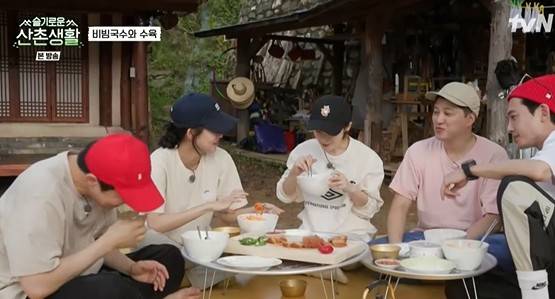 수육을 썰고 오이와 김치로 고명을 올린 소면까지 맛있는 점심 한 상이 차려졌다. 입안 가득 퍼지는 수육의 맛에 “너무 맛있다”라며 절로 감탄사가 터져 나왔다. 울기 직전의 표정으로 감동을 표현하는 메인 셰프 정경호의 맛표현에 제작진은 “본인 리액션이 제일 좋네요?”라고 웃었고 멤버들은 “정말 너무 맛있다”고 한목소리를 냈다. 조정석은 “이 맛에 고추를 딴다”고 감탄했다. 감동적인 비빔국수 맛에 김대명은 입술에 비빔국수 양념을 묻힌 채로 “내가 먹어본 국수 중에 가장 맛있다”고 밝혔다. 이에 조정석은 “멘트는 좋은데 입술 좀 닦고 말해 달라”고 말했고 김대명은 “일부러 내가 진정성 있게 만들어놓은 것”이라고 주장, 찐친 티키타카를 펼치며 폭소를 자아냈다.