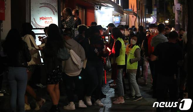 (서울=뉴스1) 임세영 기자 = 서울마포경찰서와 마포구청 관계자들이 15일 밤 서울 마포구 홍대 일대 외국인 밀집구역에서 코로나19 방역 수칙 위반(마스크 미착용, 3인 이상 집합금지, 음주소란 등)을 단속하고 있다. 2021.10.15/뉴스1