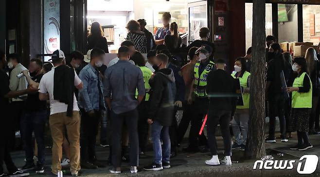(서울=뉴스1) 임세영 기자 = 서울마포경찰서와 마포구청 관계자들이 15일 밤 서울 마포구 홍대 일대 외국인 밀집구역에서 코로나19 방역 수칙 위반(마스크 미착용, 3인 이상 집합금지, 음주소란 등)을 단속하고 있다. 2021.10.15/뉴스1