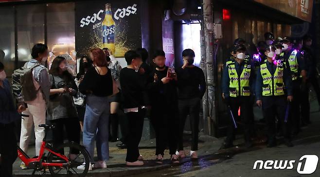(서울=뉴스1) 임세영 기자 = 서울마포경찰서와 마포구청이 특별단속에 나선 15일 밤 서울 마포구 홍대 일대에서 젊은이들이 삼삼오오 모여 있다. 이날 서울마포경찰서와 마포구청은 홍대 일대 외국인 밀집구역에서 코로나19 방역 수칙 위반(마스크 미착용, 3인 이상 집합금지, 음주소란 등)을 단속했다. 2021.10.15/뉴스1