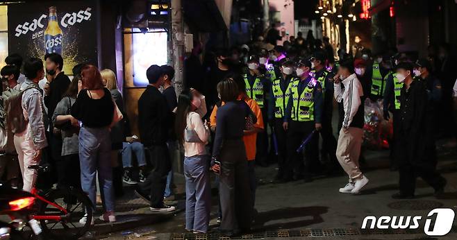 (서울=뉴스1) 임세영 기자 = 서울마포경찰서와 마포구청이 특별단속에 나선 15일 밤 서울 마포구 홍대 일대에서 젊은이들이 삼삼오오 모여 있다. 이날 서울마포경찰서와 마포구청은 홍대 일대 외국인 밀집구역에서 코로나19 방역 수칙 위반(마스크 미착용, 3인 이상 집합금지, 음주소란 등)을 단속했다. 2021.10.15/뉴스1