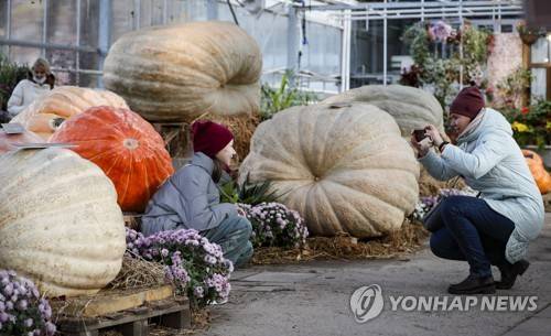 epa09525473 A girl poses for pictures near the giant pumpkins during exhibition 'The largest pumpkins grown in Russia in 2021' at the Botanical Garden of Moscow State University in Moscow, Russia 15 October 2021. The exhibition will last until 07 November. At the end of the exhibition pumpkins will be cut and distributed to visitors. EPA/YURI KOCHETKOV