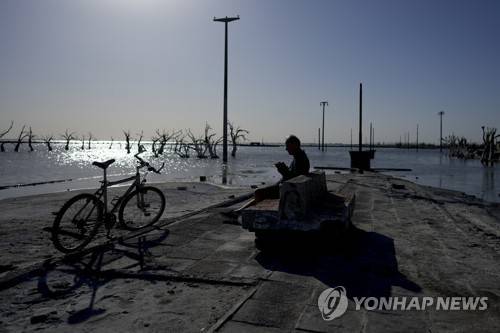 A cyclist rests by the lake of the abandoned Villa Epecuen, Argentina, Thursday, Oct. 7, 2021. The Argentine spa town was a mecca of tourism for much of the 20th century, until the adjoining lake poured through a broken embankment in 1985 and destroyed hotels, restaurants and other buildings.