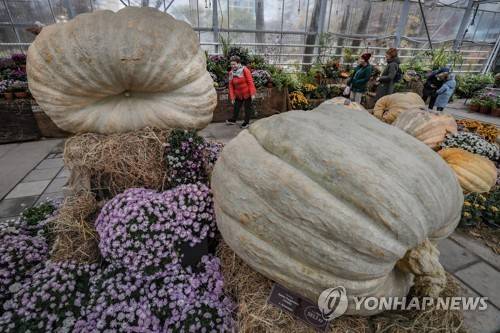 epa09525470 Visitor looks at the giant pumpkins during exhibition 'The largest pumpkins grown in Russia in 2021' at the Botanical Garden of Moscow State University in Moscow, Russia 15 October 2021. The exhibition will last until 07 November. At the end of the exhibition pumpkins will be cut and distributed to visitors. EPA/YURI KOCHETKOV